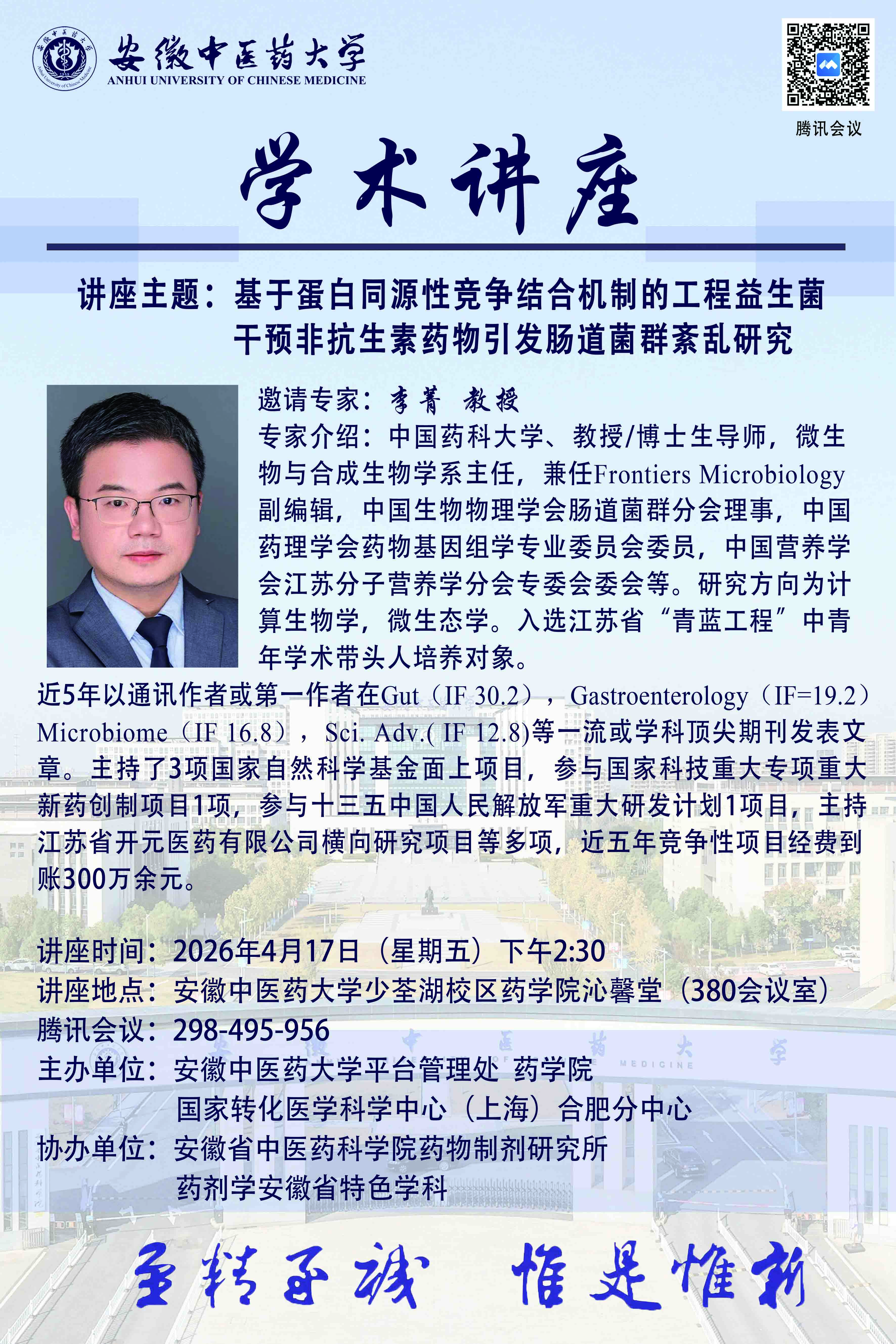 【学术讲座】基于蛋白同源性竞争结合机制的工程益生菌干预非抗生素药物引发肠道菌群紊乱研究
