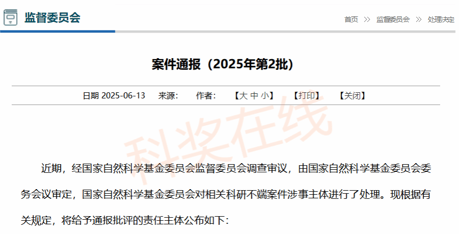 近期,经国家自然科学基金委员会监督委员会调查审议,由国家自然科学基金委员会委务会议审定,国家自然科学基金委员会对相关科研不端案件涉事主体进行了处理。现根据有关规定,将给予通报批评的责任主体公布如下:
