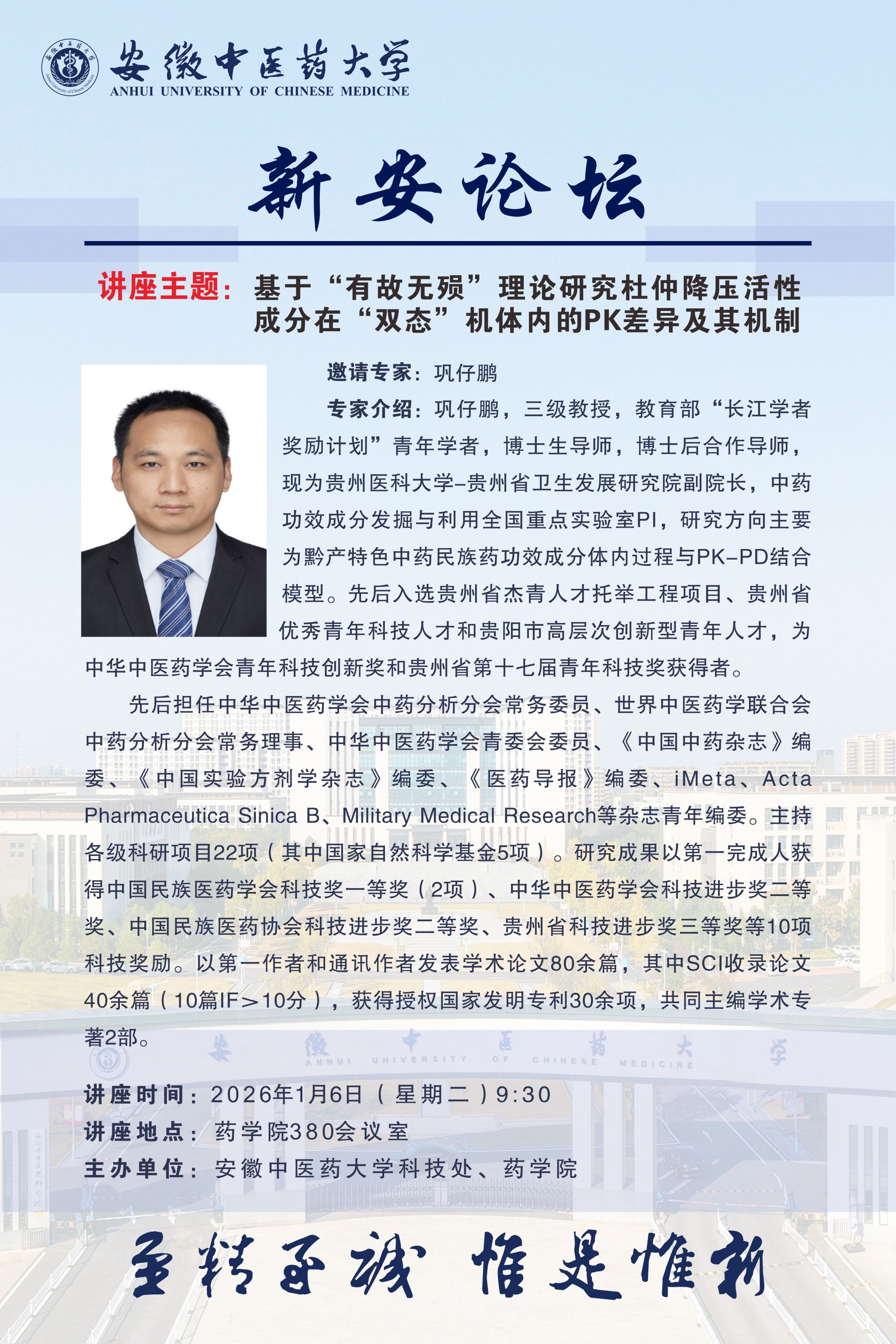 【学术讲座】基于“有故无陨”理论研究杜仲降压活性成分在“双态”机体内的PK差异及其机制